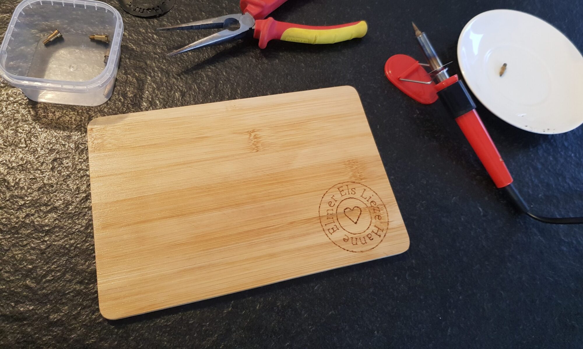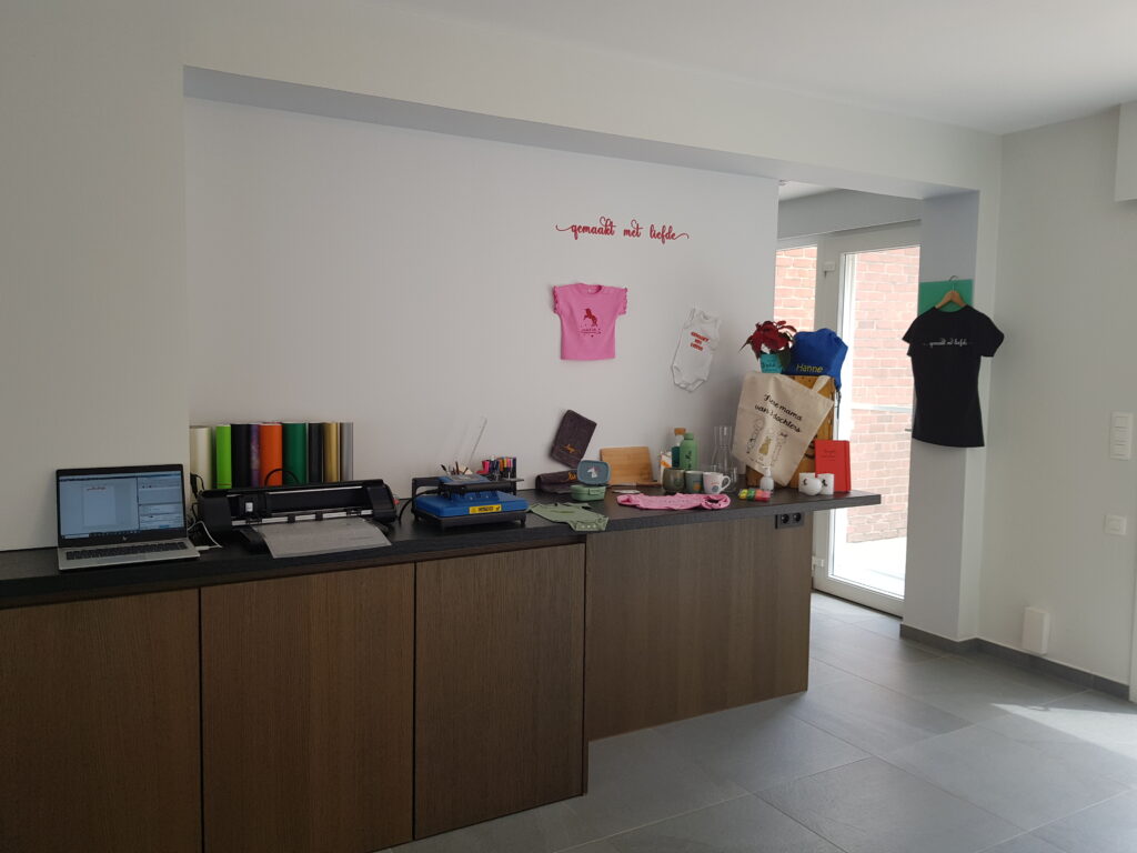 Aangezien het rondlopen heel erg pijnlijk was, heb ik me ondertussen ook geen attenties gemaakt. Tijdens zo’n “maak-proces” zet je toch veel kleine stappen: tussen mijn computer, mijn plotter en al mijn materiaal.